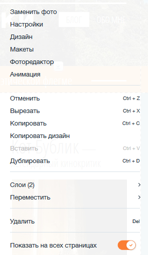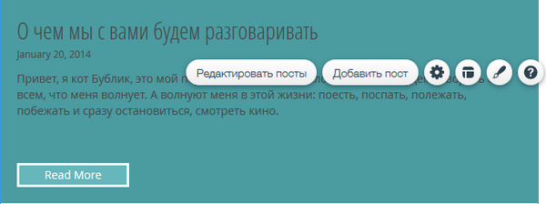 При щелчке левой кнопкой мыши в любом месте ленты блога появляется вот такое меню: редактирование поста, добавление нового поста, настройки ленты блога и всех его элементов, макет записей блога, включение-выключение элементов дизайна, помощь.