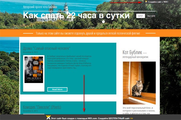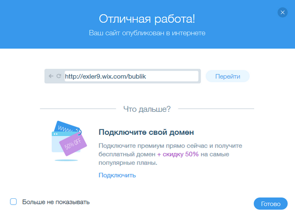 Адрес сайта, конечно, получается не очень простой, а кроме того, для бесплатных аккаунтов на странице справа сверху и полоской снизу выводится небольшая реклама Wix.