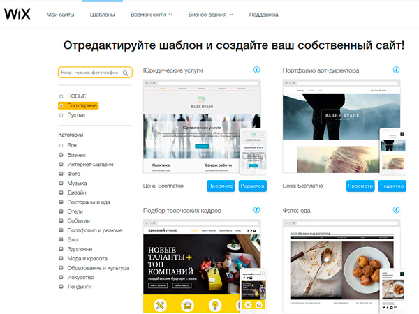 Перед выбором шаблона постарайтесь заранее понять, что и как вы хотите размещать на своем сайте, чтобы подобрать соответствующую разметку. Впрочем, у Wix достаточно гибкий редактор шаблонов, так что если вы что-то упустите - в дальнейшем вы сможете добавить в структуру сайта все, что вам нужно.