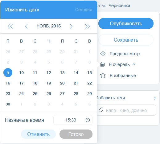 Новую запись можно сохранить в черновиках без опубликования, опубликовать немедленно и опубликовать по расписанию - в указанное время в указанную дату.