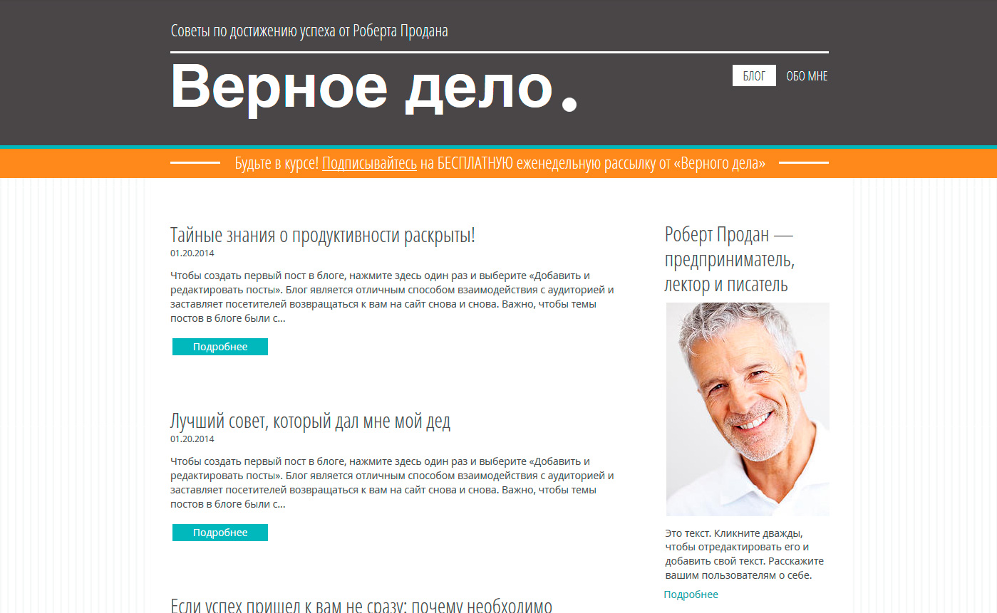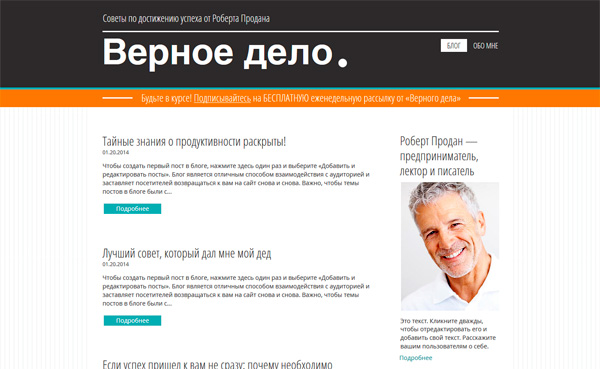 Давайте для примера выберем шаблон "Блог предпринимателя" - мне он по стилю оформления понравился. По исполнению это классический standalone blog - отдельный персональный блог, не связанный с какими-то блог-хостингами вроде Livejournal.