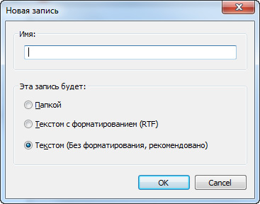 Сначала даете имя записи (папки) - под этим именем запись будет фигурировать в списке. В нашем случае напишем "Мой домашний адрес". Если вы хотите создать папку с таким именем - выберите пункт "Папкой". Если вы хотите запись текст с форматированием (RTF-формат) - выделение шрифтов, различные цвета, различные гарнитуры и кегли шрифтов, - выберите "Текстом с форматированием". Однако форматирование нужно использовать только для тех текстов, которые вы будете вставлять, например, в текстовый редактор. Для всех остальных случаев лучше выбирать вариант по умолчанию - текст без форматирования, чтобы его можно было вставлять в любых программах.