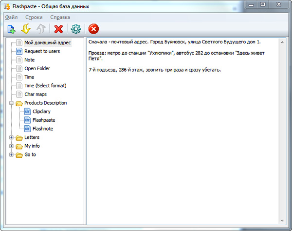 Набрали текст - и все, окно можно закрыть, все сохраняется автоматически. Теперь, когда вам нужно кому-то в письме или в чате сообщить ваш адрес, нажимаете клавиши вызова FlashPaste, в окне выбираете заголовок записи с адресом (при наведении курсора на заголовок справа в подсказке выводится полный текст записи) и нажимаете Enter - запись будет вставлена.