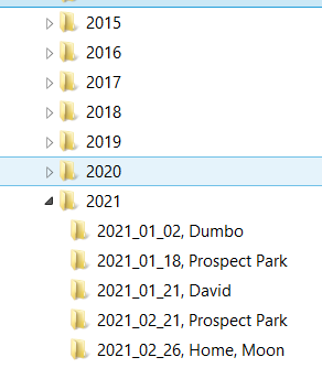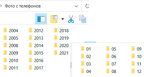 В результате у меня папка "Фото с телефонов" представляет собой фотографии, разбитые по годам и месяцам. И так значительно удобнее этим пользоваться, чем когда фото лежат бессмысленной грудой, ведь когда ищешь фото кого-то события, всегда более или менее примерно представляешь, когда это все происходило.
