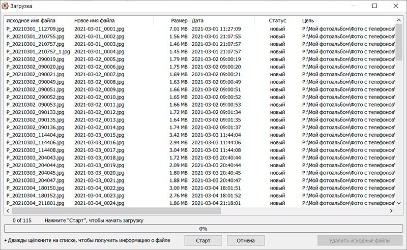 Далее останется нажать кнопку "Загрузить", посмотреть, что и как программа будет создавать, после чего нажать кнопку "Старт" - и далее все сделают за вас, фотографии будут должным образом рассортированы по папкам.