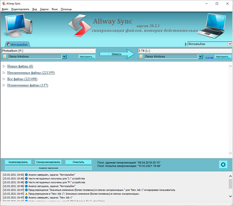Вся процедура происходит почти мгновенно (если бэкап обновлялся не слишком давно), причем вы можете создать несколько закладок с синхронизациями разных папок на разные устройства, а если целевые диски, на которые делаются бэкапы, постоянно доступны в локальной сети, то здесь можно настроить автоматическую синхронизацию, после чего вы будете иметь полностью актуальную копию, не прикладывая к этому вообще никаких усилий.