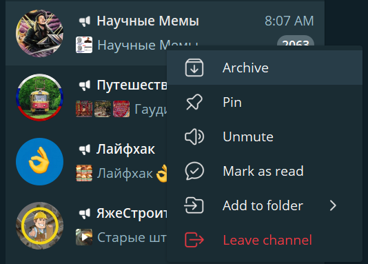Что интересно, в десктопной версии каналы папки можно пометить как прочитанные, а в мобильной версии такой возможности почему-то нет. Однако в мобильной версии конкретный канал можно пометить как прочитанный (длинное нажатие и дальше пункт в меню).