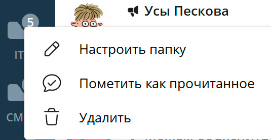 Созданные папки появятся в основном окне Telegram в виде закладок. Порядок этих закладок/папок можно менять длинным нажатием на любой закладке. В том же контекстном меню можно сразу перейти в настройки папки или удалить папку. При удалении папки никакие каналы, находящиеся в ней, разумеется, не удаляются.