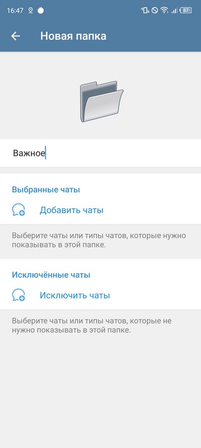 Появляется список папок, где можно создать новую папку. При создании папке нужно дать понятное имя, после чего добавить туда соответствующие чаты (каналы).