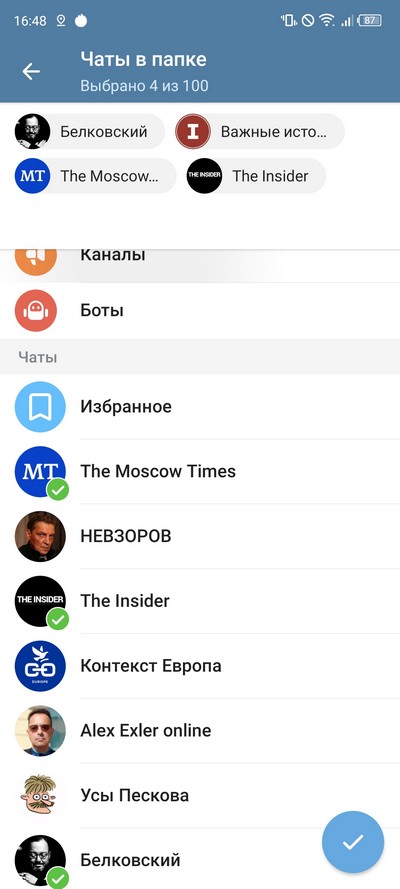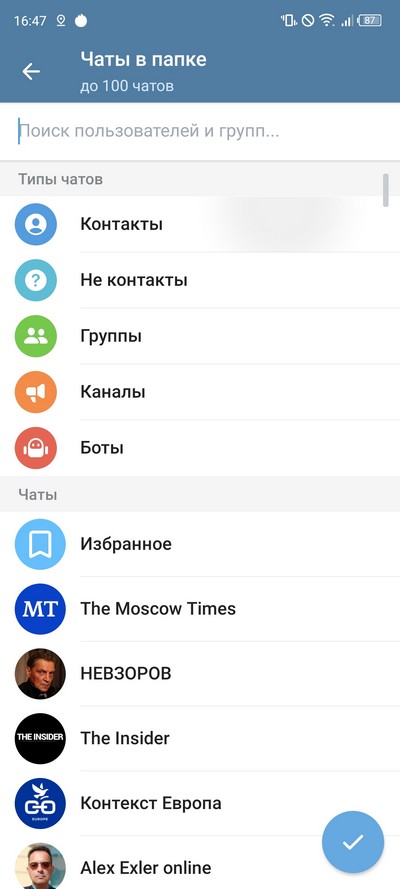После того как название папке дано, нужно нажать на ссылку "Добавить чаты" и там выбрать нужные вам каналы. При этом их еще можно отсортировать по типам: контакты, не контакты, группы, каналы, боты. (Также любой из этих типов можно добавить в папку - например, сделать папку только с группами или только с каналами.) - Выбранные каналы появятся сверху в списке чатов. Оттуда их, конечно, можно убирать при необходимости.