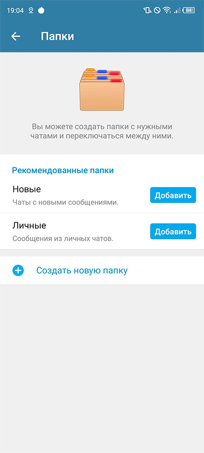 При первом заходе в раздел "Папки" в мобильном приложении вам не предлагают рекомендованные папки, а при следующем заходе такая возможность появляется, и я очень советую эти папки создать - они полезные. Удобно иметь папку с новыми сообщениями, а также папку только с личными контактами.