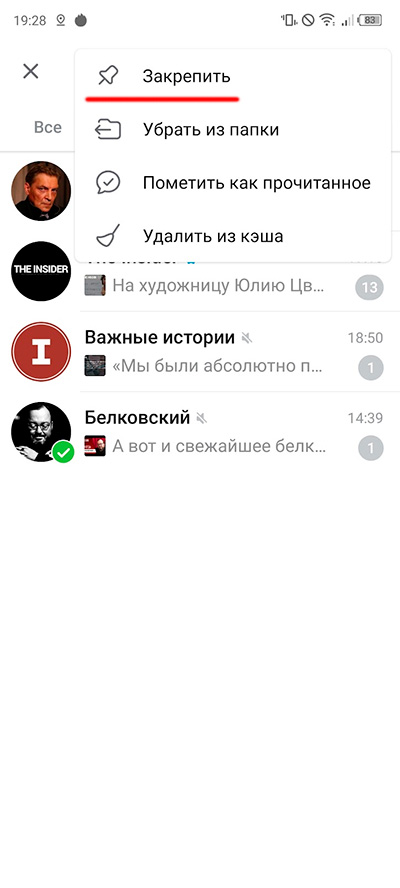 Там нажать на три точки и в появившемся меню выбрать пункт "Закрепить". После этого соответствующий канал (или каналы, если выбрано несколько) всегда будет показан сверху в данной папке (если его закрепили именно в этой папке).