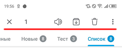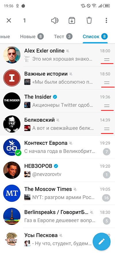 Важный элемент дополнительной настройки папки - закрепление каких-то каналов сверху. Особо важные каналы вы можете закрепить как в общем списке всех чатов, так и в конкретной папке. Для этого нужно сделать длинное нажатие на канале (также можно отметить несколько каналов) - там сверху появится соответствующие пиктограммы: закрыть плашку с пиктограммами и меню, количество выбранных каналов, включить/выключить уведомления, убрать из папки, меню.