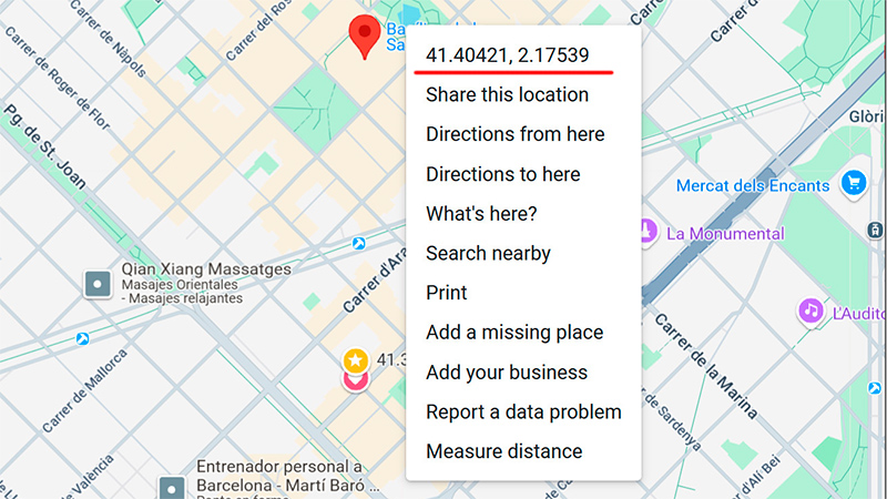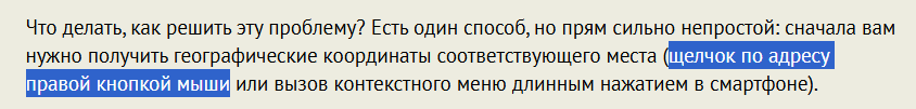 Что делать, как решить эту проблему? Есть один способ, но прям сильно непростой: сначала вам нужно получить географические координаты соответствующего места (щелчок по адресу правой кнопкой мыши или вызов контекстного меню длинным нажатием в смартфоне).