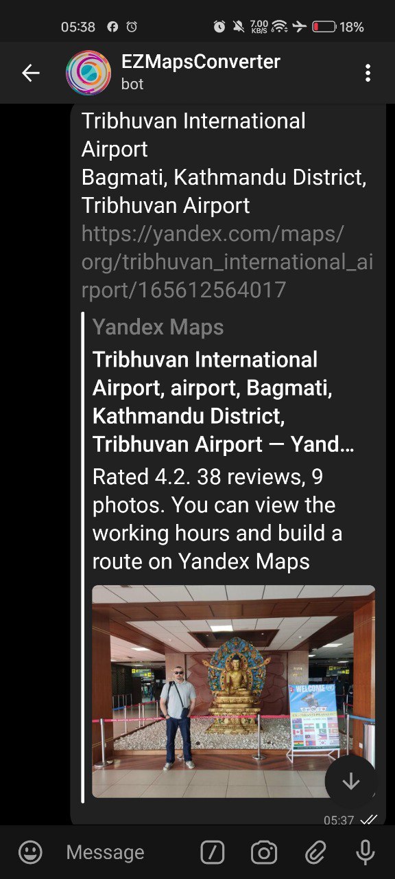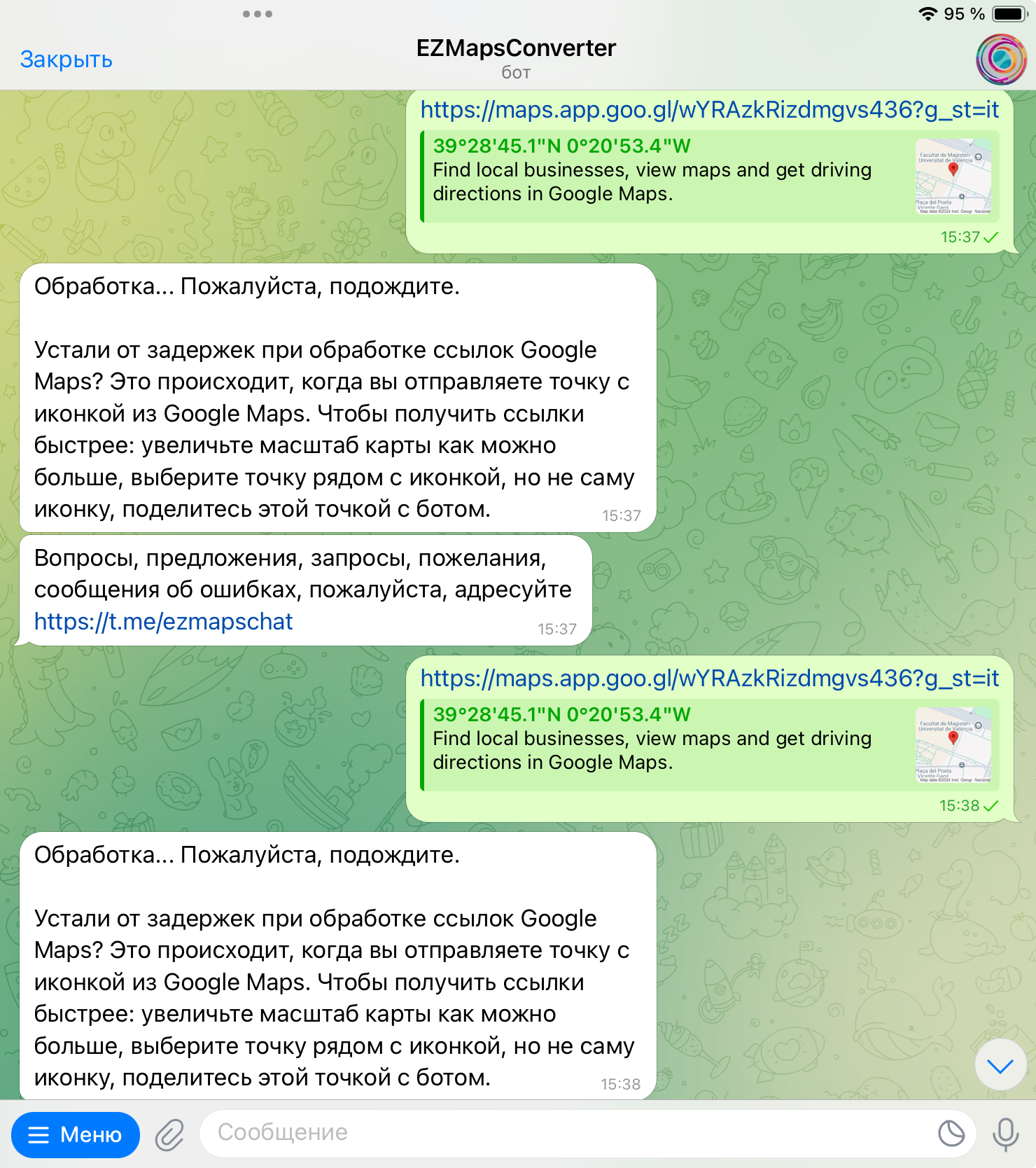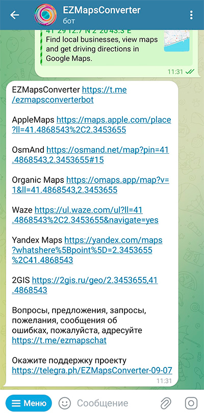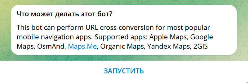 Все это вылилось в телеграм бота, с которым можно поделиться ссылкой из поддерживаемого картографического приложения и получить в ответ ссылки в форматах других поддерживаемых картографических приложений.