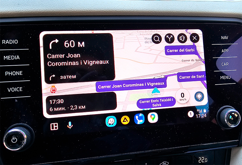 Доступны все соответствующие приложения, вы можете использовать любую привычную систему навигации (у меня это Waze и изредка навигация Google). Набор приложений настраивается в смартфоне в Android Auto/Apple CarPlay.