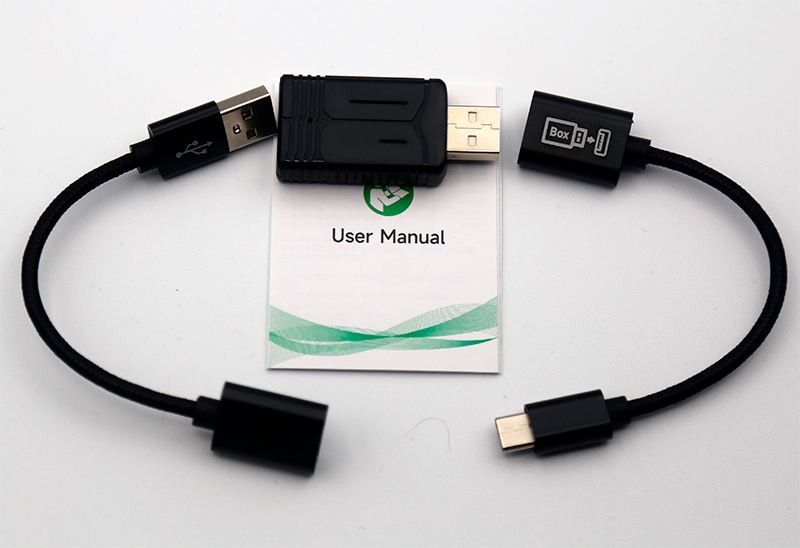 Комплект поставки: адаптер, руководство пользователя на английском, два кабеля - удлинитель USB-A и кабель для подключения адаптера к Type-C. (Обычно в автомобилях размещают порт USB-A для подключения различных устройств, но, возможно, Type-C тоже встречаются.)