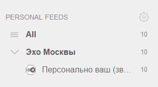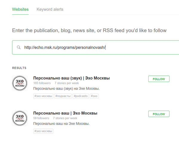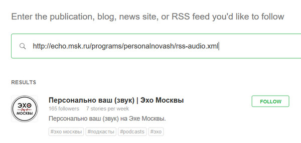 Там в строке поиска нужно указать или адрес RSS-потока, или страницу, на которой находится RSS-поток(и). В случае с "Персонально ваш" (и любыми другими передачами "Эха") можно вбить просто адрес страницы - Feedly сам предложит выбрать потоки для подписки: звук или текст.
