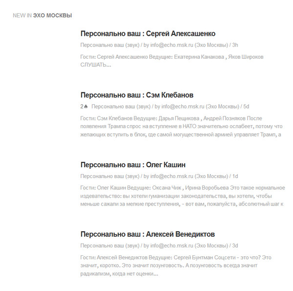 Истину глаголете, приложение абсолютно идеальное. Я подписан отдельно на все интересующие меня передачи на "Эхе" и "Вести FM", ну и ещё по мелочам, очень удобно.
