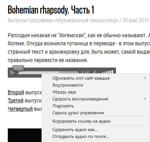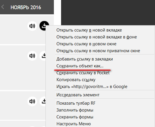 Например, на сайте "Серебряный дождь" архивы передач выкладываются в виде плеера для прослушивания в браузере, однако на плеере также можно нажать правую кнопку мыши и выбрать пункт "Сохранить аудио как..." или "Отправить аудио по почте...".