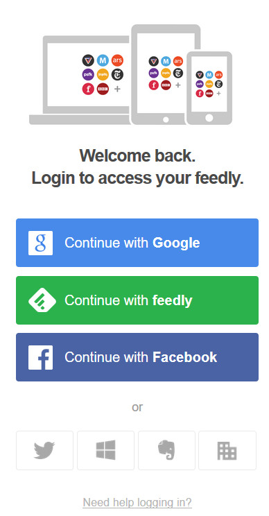 Начать работать с этим сервисом очень просто. Заходите на сайт Feedly и нажимаете на кнопку Login. Там появляется окно выбора: использовать учетку Google, собственную регистрацию в Feedly, учетку Facebook и так далее.