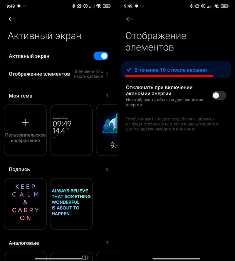 Выглядит это следующим образом. Во всех смартфонах Xiaomi бюджетного и среднего уровня на HyperOS - это все модели Redmi и POCO - в настройках активного экрана есть вариант только "В течение 10 с после касания".
