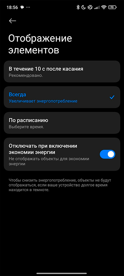 Однако у смартфонов, которые выпускаются под брендом Xiaomi (раньше они назывались Xiaomi Mi, но потом "Mi" убрали), в разделе "Отображение элементов" мы, кроме 10 секунд, видим еще следующие варианты: "Всегда" и "По расписанию". И у этих смартфонов AOD - полноценный, именно такой, каким он должен быть.