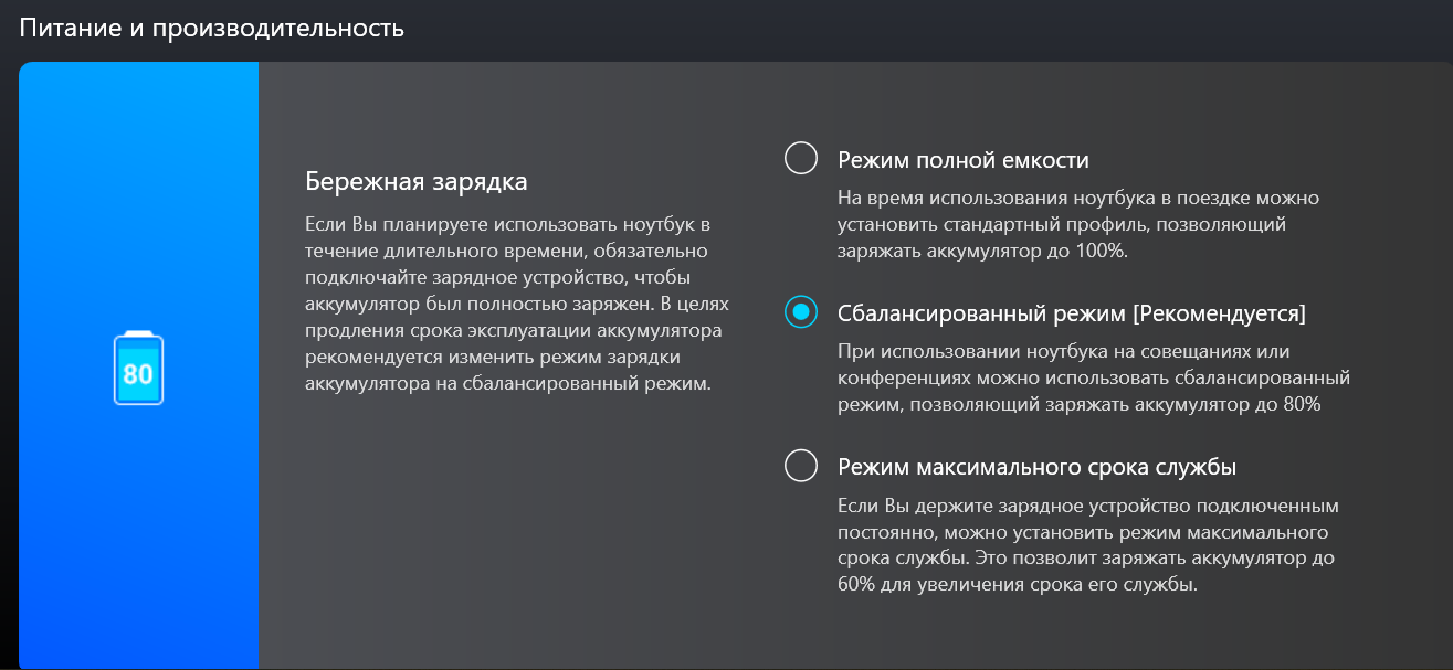 Вообще самое идеальное было у Самсунга, когда можно было заряд до 80% ограничить и работать на нем при подключении к сети. У меня так очень долго жил аккум. Удивлен, что другие производители так не делают. На MacBook есть сторонние решения, но работают нестабильно, есть жалобы. А там прям в биосе была эта настройка.
