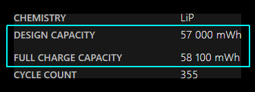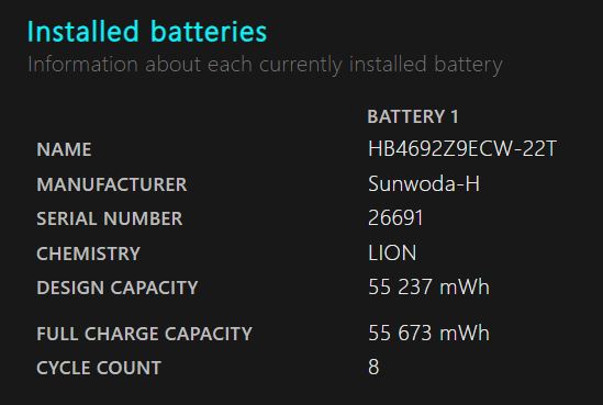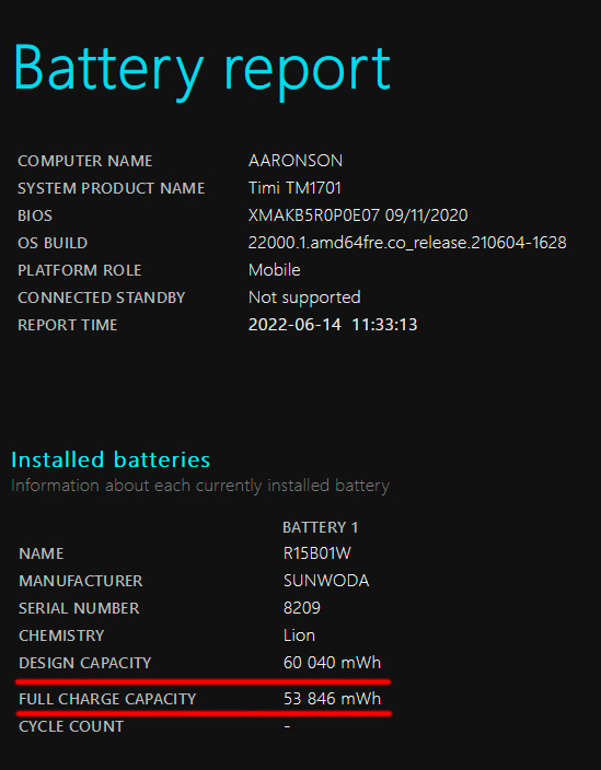 Что там есть? Там самое интересное - заводская ёмкость аккумулятора и нынешняя полная ёмкость. В моём случае отчёт показывает, что аккумулятор потерял только 10% ёмкости, что очень даже хорошо, учитывая тот факт, что этот ноутбук Xiaomi Mi Notebook Pro был куплен в ноябре 2018 года. Но, впрочем, он у меня только для поездок, так что использовался мало.