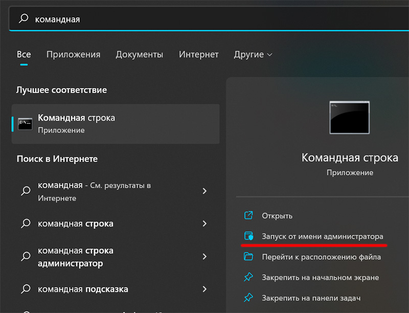 Сначала нужно запустить командную строку (она же cmd.exe) в режиме администратора (если вы работаете в режиме обычного пользователя). Для этого в поиске (строка или иконка слева в панели задач) наберите "Командная строка" (или просто cmd) и там выберите соответствующий пункт.