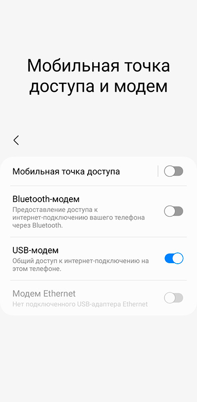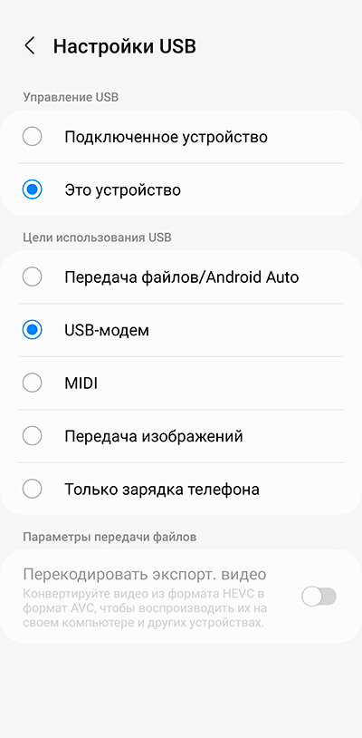 Ну и последний вариант, совсем странный - подключение через кабель USB. Настройки, выбираем USB-модем - после этого при подключении смартфона к ПК/ноутбуку можно будет подключиться к Интернету. Не очень понятно, какой в этом смысл, но, может, это для ситуаций, когда вообще не работают беспроводные средства связи.