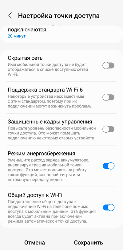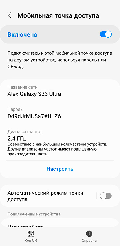 Плюс бывают и всякие другие настройки, также часто смартфон может сгенерировать QR-код для подключения других устройств - чтобы вручную не вводить пароль, и это очень удобно.