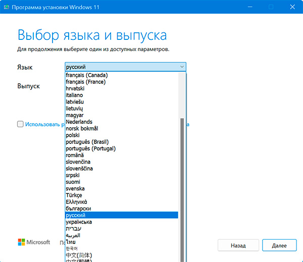 Сначала можно попробовать просто зайти на американский сайт загрузки - Windows 10, Windows 11 - и загрузить оттуда. Несмотря на то что утилита скачивается с американского сайта, язык её интерфейса она возьмет из настроек системы, а язык интерфейса Windows можно выбрать любой из списка.