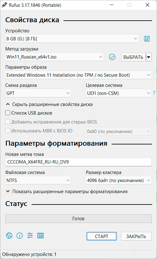 Нажимаем кнопку "Старт", после чего дожидаемся, когда процесс будет закончен, и у нас после этого будет загрузочная флешка.