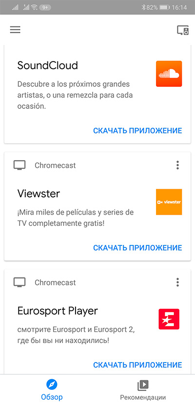 В Google Home дается список приложений с поддержкой Chromecast.