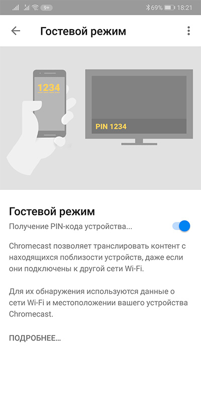 А еще здесь есть специальный гостевой режим. Для его включения нужно выбрать Chromecast в устройствах Google Home и там выбрать в меню "Гостевой режим".