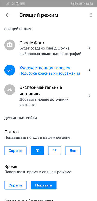 В спящем режиме Chromecast показывает на экране красивые фотографии из художественной галереи. Если вы хотите, чтобы он показывал какие-то ваши альбомы, то их нужно загрузить в "Google Фото", после чего для конкретного устройства в Google Home зайти в "Настройки спящего режима". Там выбираете в качестве источника "Google Фото" и нужные альбомы.