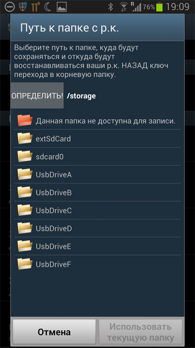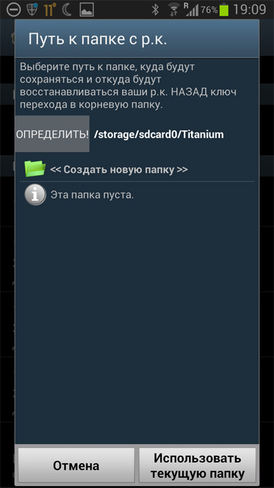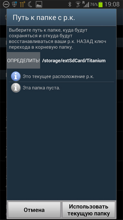 Прежде чем делать бекап, необходимо задать соответствующую папку для хранения данных. По умолчанию программа выбирает встроенную память телефона, и это чревато потерей бекапа в случае, если в телефоне будут восстанавливаться заводские настройки.