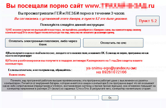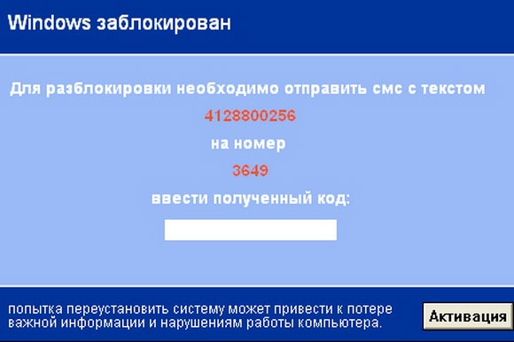 Многим беспечным пользователям приходится сталкиваться с баннером, который блокирует операционную систему Windows и за разблокировку требует тем или иным образом (обычно по SMS) прислать денег - после этого, дескать, вам будет прислан соответствующий код, который уберет этот баннер. Также встречается модификация в виде постоянно висящего в браузере порнобаннера, который требует денег за то, чтобы его убрать. И еще один вариант - вирус шифрует вашу папку с документами и требует денег за расшифровку.