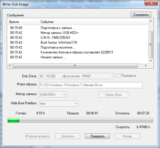 Ну и остается только нажать кнопку "Записать". Процесс может продолжаться минут десять.