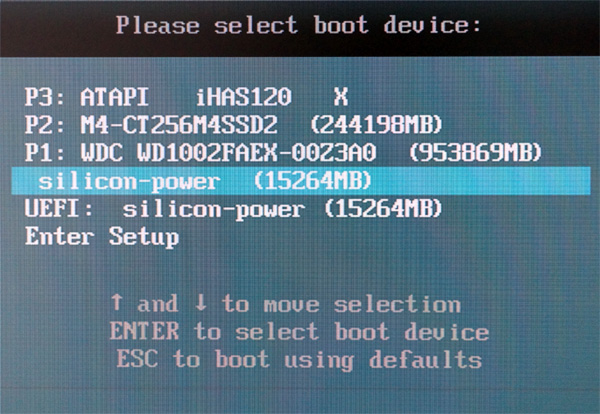 Там выбираете вашу флешку и нажимаете Enter - начинается загрузка.