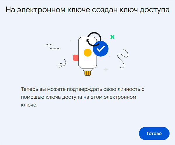 Ну и все - Google сообщил, что на данном электронном ключе создан ключ доступа, и с его помощью можно подтверждать свою личность.