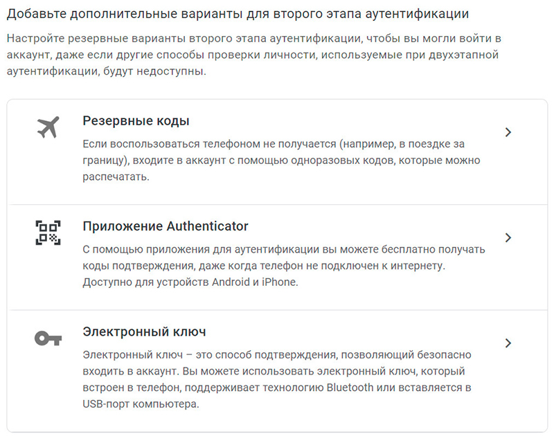 Гугл предлагает различные альтернативные способы двухфакторной аутентификации: письмо на почту, SMS на номер телефона, подтверждение на доверенных устройствах (смартфонах, планшетах), аутентификация через приложение (то, что мы только что рассмотрели выше), резервные коды (распечатанные на бумаге) и наконец - через электронный ключ. Вот этот вид - электронный ключ, - мы и выбираем.