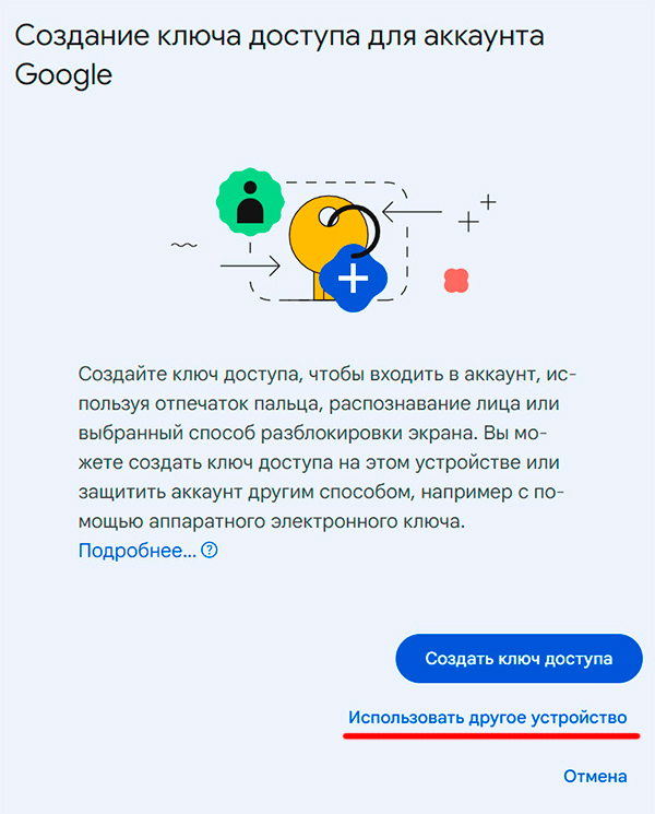 Там выбираем "Создать ключ доступа" и в появившемся окне нажимаем "Использовать другое устройство".