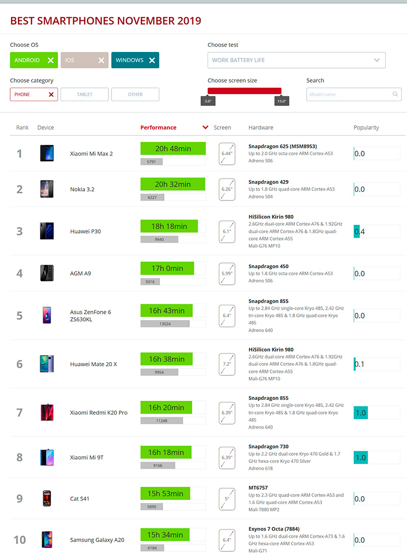 Рейтинг самых автономных смартфонов можно посмотреть на сайте PCMark - это по результатам соответствующего теста, в котором имитируются самые разнообразные виды нагрузок.