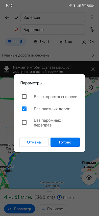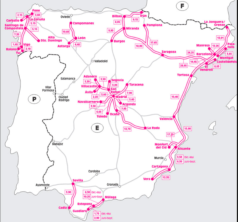 Что же касается дальних направлений, то там использование платных скоростных дорог может заметно сэкономить время. Например, поездка из Барселоны в Валенсию по платным дорогам - 3 часа 43 минуты. А по бесплатным - 4 часа 51 минута. Здесь экономия получается очень существенная.
