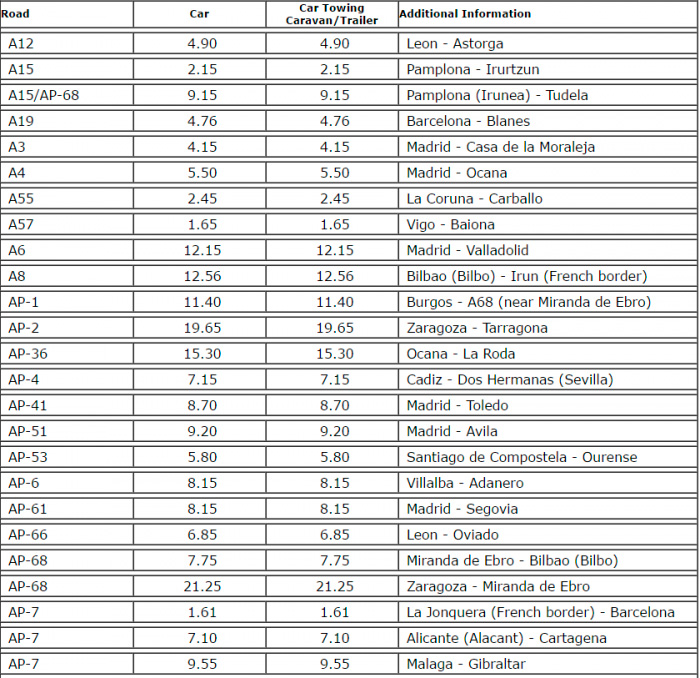 Дороги Испании подразделяются на бесплатные (Autovia) и платные (Autopista). О приближении к платной дороге на дорожных указателях всегда сообщают надписью Peaje, заключенной в красный кружок. Платная дорога - всегда в несколько рядов, там нет светофоров и переездов, ограничение скорости - 120 км/ч. При этом радары там очень мало где установлены, о них предупреждают знаками, так что реально по скоростным трассам многие водители ездят со скоростью 140-150 км/ч.