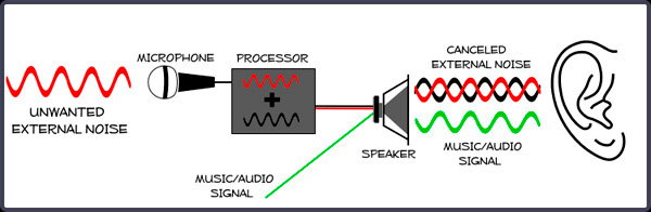 Принцип работы активного шумоподавления можно изложить очень просто. Микрофон, встроенный в наушник, улавливает окружающий звук, и этот звук динамиком наушника воспроизводится с той же амплитудой, но в противофазе. При этом совершенно необязательно понимать, что такое амплитуда и противофаза, тут просто надо знать, что когда данные две звуковые волны смешиваются, то они подавляют друг друга, что для пользователя приводит к значительному снижения уровня раздражающих слух низких частот (например, шума двигателя самолета, шума поезда).