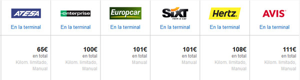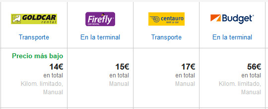 Об аренде машин за границей я писал в соответствующей подробной статье. Поэтому кратко для Испании. Обычно непосредственно в аэропорту располагаются стойки только крупных международных компаний: Europcar, Avis, Hertz, Ateza. И если у вас нет корпоративной карточки какой-то из этих компаний - туда лучше не соваться, потому что будет очень и очень дорого. Вот, для примера, предложения класса Mini через Expedia на недельку в конце апреля с прилетом в Барселону.