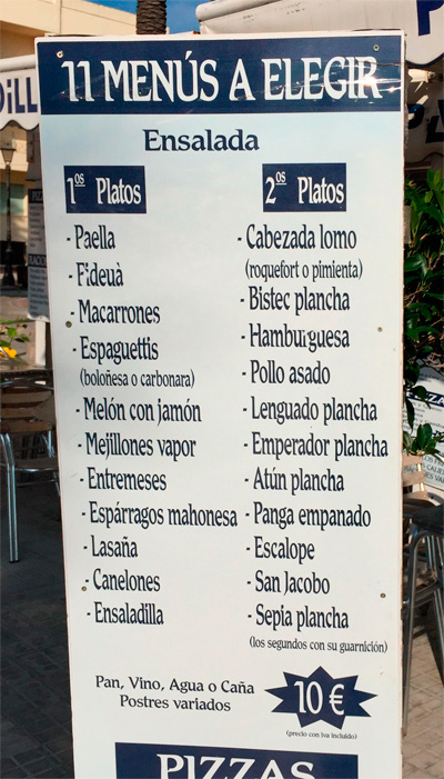 Важный момент. То что вы подразумеваете под меню - в Испании называется La carta (ла карта). А если вы попросите "меню" (по-испански это произносится как "мэну") - вам принесут menu del dia, то есть бизнес-ланч.